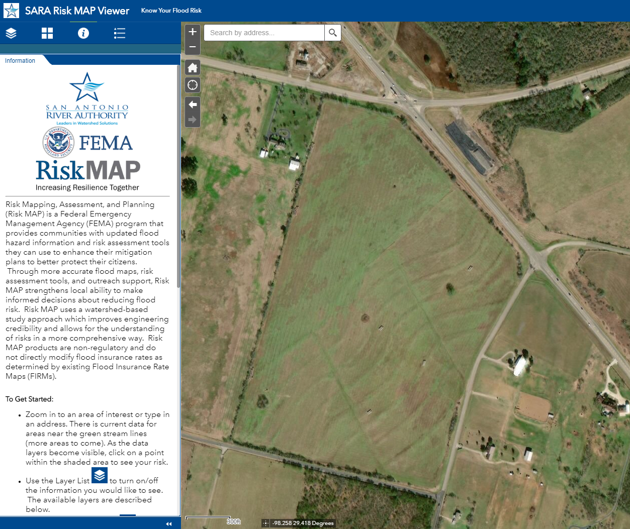 Federal Emergency Management Agency maps do not show any 100-year flood plain on this property. See also the SARA Risk MAP Viewer.